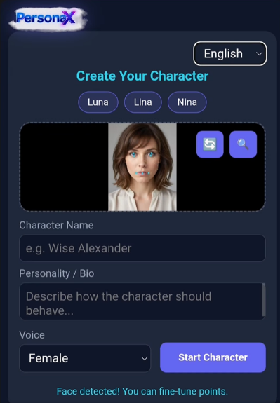 Talk in real time with a virtual persona. Upload a face, set a personality, tweak the voice, and chat live. Supports 3 languages, fully customizable characters including face detection fine-tuning and voice selection.