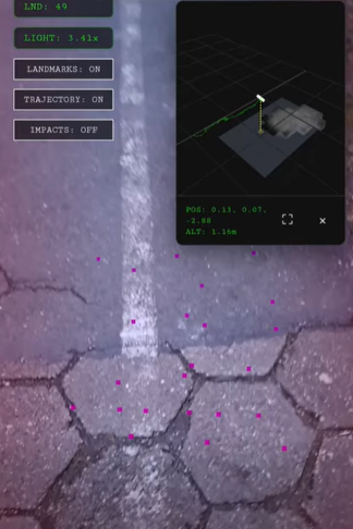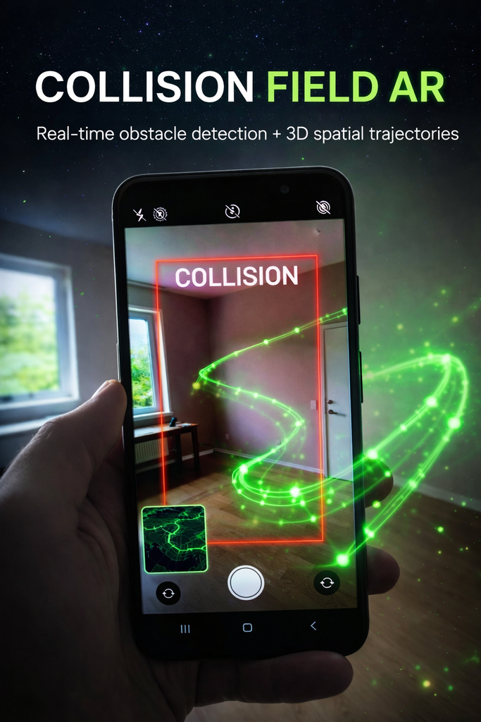 AR app that perceives surroundings in real time using a single monocular camera in a mobile browser. Detects walls, floors, furniture, stairs, and drop-offs; builds a local 3D occupancy grid with an attention mechanism that updates only currently observed regions. Provides visual red-edge warnings, haptic feedback, a live top-down mini-map, and records 3D camera trajectories. No LiDAR, no cloud, no app install.