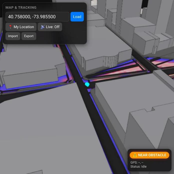A real-world GPS map that models traversable space, not just routes. Features live GPS tracking, 3D building extrusions from OpenStreetMap, and a collision/occupancy heatmap. Built for spatial cognition research, robotics, AR, and accessibility applications.