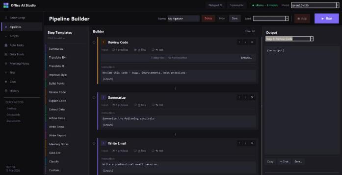 Open-source, 100% local AI automation suite for office work. Smart Drop Zone for drag-and-drop actions, Pipeline Builder for multi-step workflows, Python script automation, Auto Tasks triggered by file rules, CSV/data tools, and Meeting Notes → tasks + email drafts. Works with Llama, Mistral, Bielik and any Ollama model.