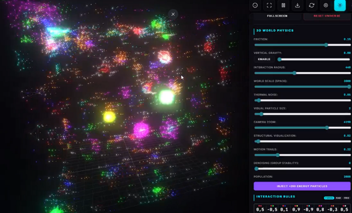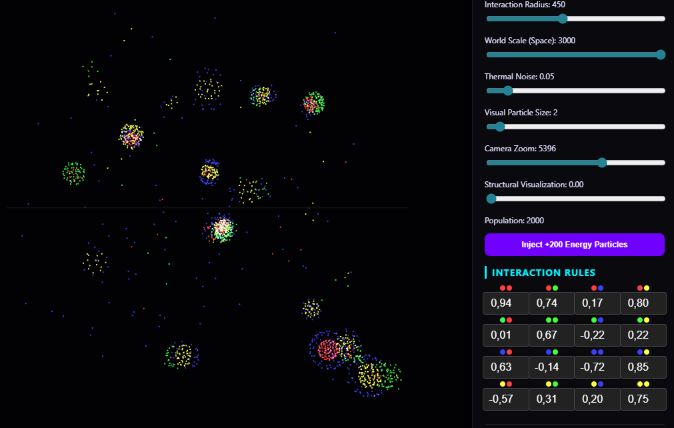 Particles governed by basic interaction rules (attraction/repulsion by type) spontaneously form complex self-organizing structures resembling living organisms - from simple clusters to ecosystems with predation, symbiosis, and reproduction. Adjustable parameters (forces, velocities, friction, particle types) enable exploring infinite "worlds" and discovering new digital life forms.