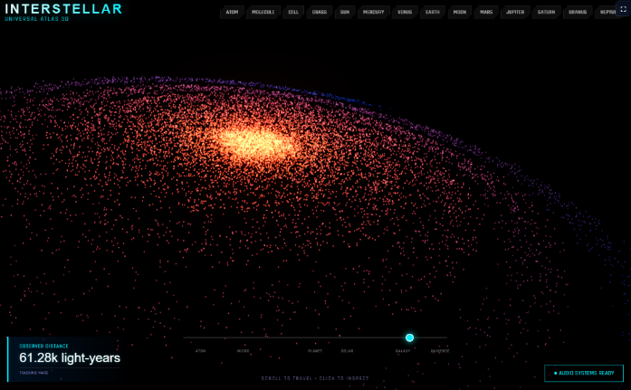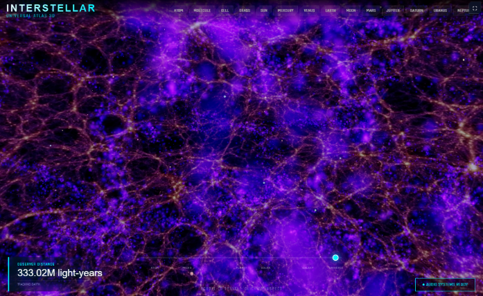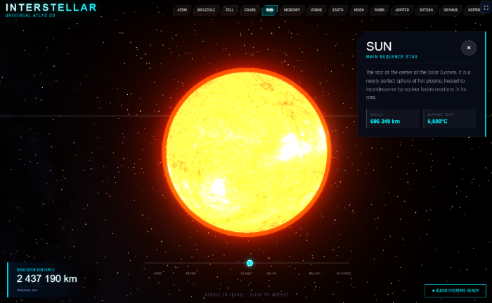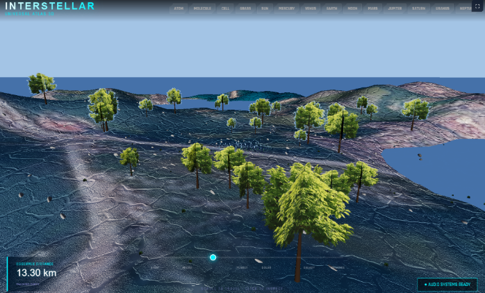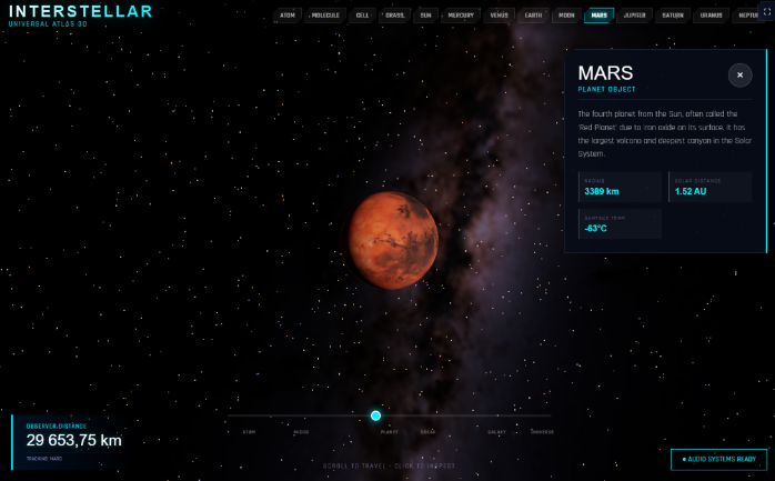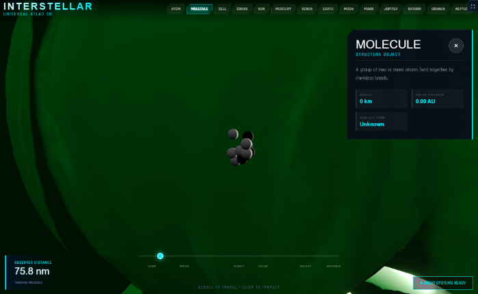 Interactive 3D atlas of the universe with seamless scale transitions - from atomic and molecular structures through cells, grass, planets (Mercury to Neptune), star systems, the Milky Way, and large-scale cosmic structure. Spatial exploration with a unified model of the cosmos, real-time audio systems, and clickable object info panels.
