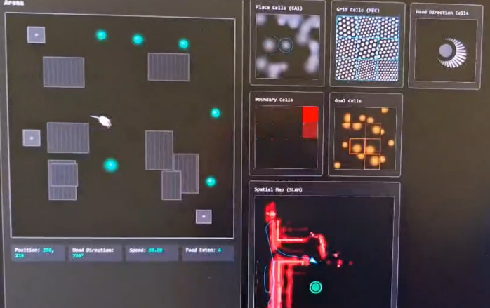 Biologically inspired navigation agent using place cells, grid cells, head-direction cells, and SLAM-like memory. The agent explores an arena, avoids obstacles, builds a spatial map, and finds food autonomously - all driven by the same cell types found in mammalian hippocampus.