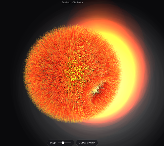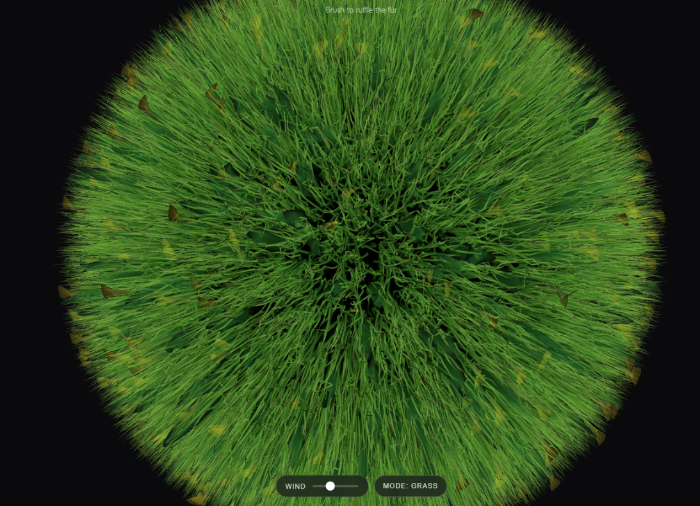 A calming, tactile browser experience. Gently pull, brush, and stroke a soft furry sphere rendered with real-time strand simulation. Multiple modes including grass and magma. Designed as a simple, soothing interaction for stress relief and focus.