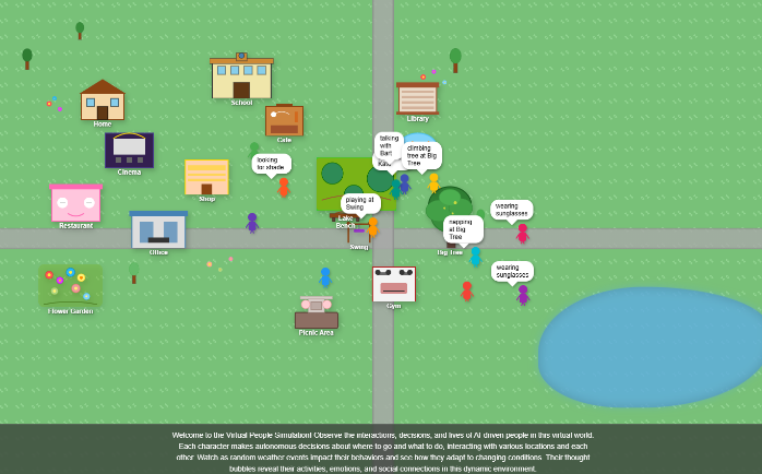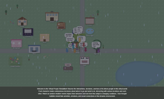 Observe the interactions, decisions, and lives of AI-driven people in a virtual world. Each character makes autonomous decisions about where to go and what to do, interacts with locations and other characters, and adapts to random weather events. Thought bubbles reveal their real-time activities, emotions, and social connections.