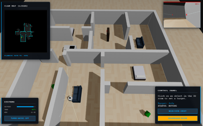 Interactive SLAM demonstration where clicking any object in a 3D room causes a robot to automatically plan a path, avoid obstacles, and update its environmental map in real time. Shows SLAM algorithms in practice - from robot localization to A* path planning.